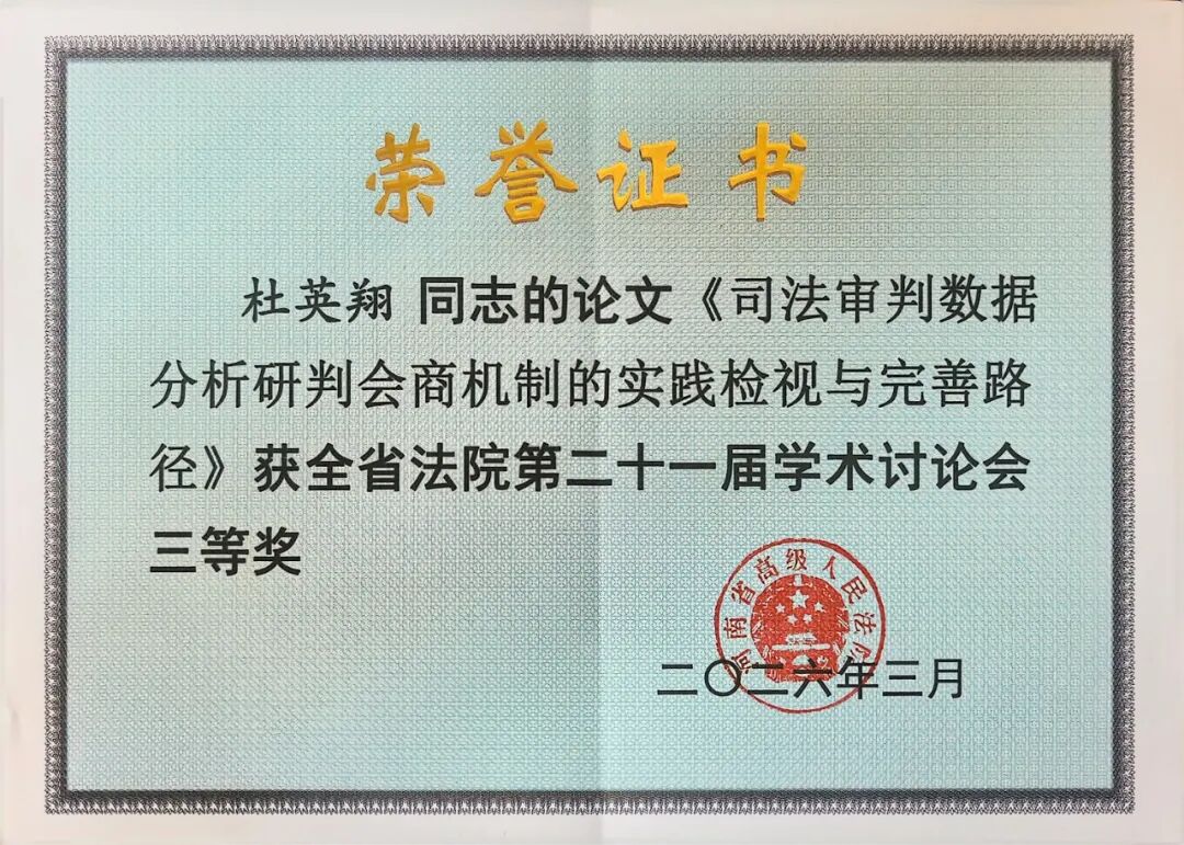 近日,全省法院第二十一届学术讨论会论文评选结果正式揭晓。泌阳法院杜英翔同志撰写的学术论文《司法审判数据分析研判会商机制的实践检视与完善路径》荣获本次学术讨论会三等奖。