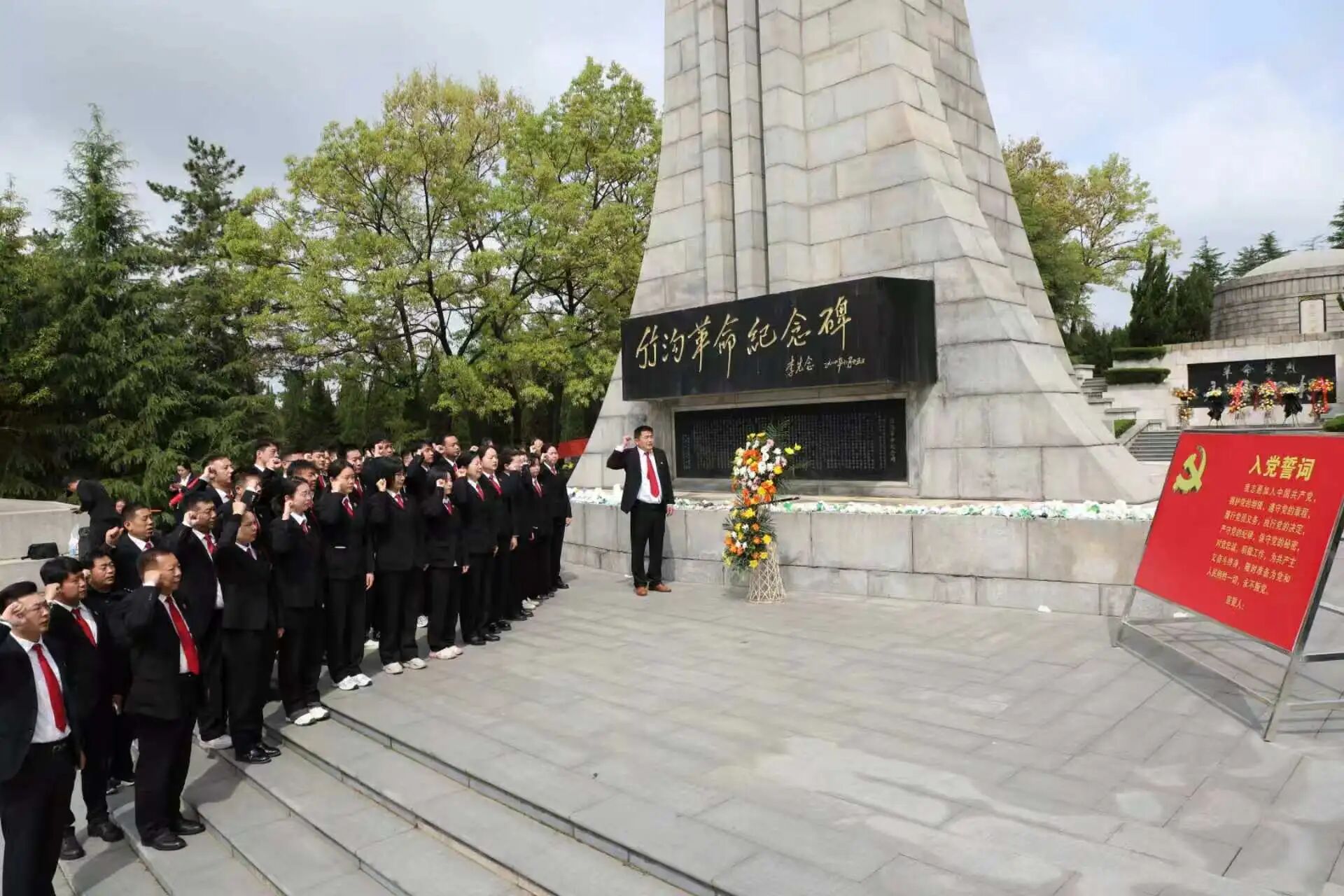 活动现场,庄严肃穆,气氛凝重。干警身着制服,整齐列队于革命烈士纪念碑前,神情肃穆,怀着对革命先烈的无限崇敬,向烈士纪念碑敬献花篮。随后,干警集体肃立,向革命先烈三鞠躬,在庄重的仪式中追忆先烈们为民族独立、人民解放抛头颅、洒热血的英勇壮举,感悟他们不畏艰险、无私奉献、舍生取义的崇高精神。鞠躬完毕,干警面向鲜红的党旗,高举右拳,庄严重温入党誓词,铿锵有力的誓言回荡在陵园上空,既是对革命先烈的深情告慰,也彰显着新时代法院干警不忘初心、牢记使命、忠诚履职的坚定决心。