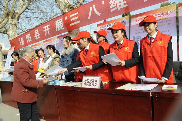 桃花春色暖先开,明媚谁人不看来。2017年3月8日,正值这桃花盛开之际,我们迎来了第107个国际劳动妇女节,同时也是《中华人民共和国反家庭暴力法》实施刚刚满一年,为进一步深化妇女法制宣传教育,强化妇女维权服务,把法制宣传教育工作作为一项重要的社会公益事业和政府责任,泌阳县人民法院联合泌阳县妇联在全县范围内开展“‘三八’维权周”普法宣传活动。